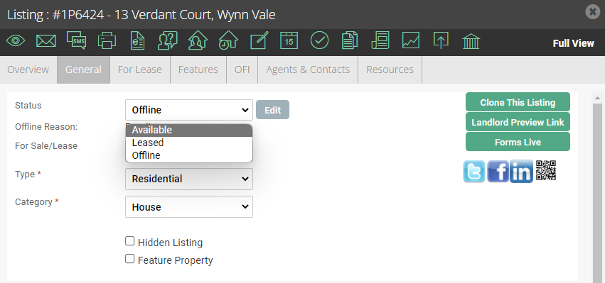 To make the listing live on the relevant portals you need to navigate to the 'General' tab and select 'Available' from the status.