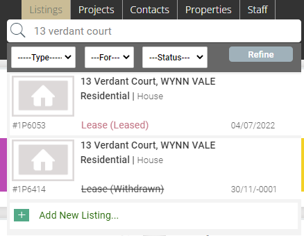 In the search bar at the top, select listings and type in the property address on the search bar at the top of the page. If there is a previous listing, follow the steps above on how to clone a property/listing. If the listing does not come up, select + Add New Listing at the bottom of the list.