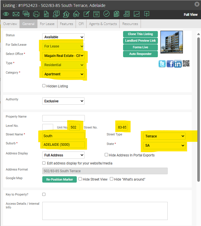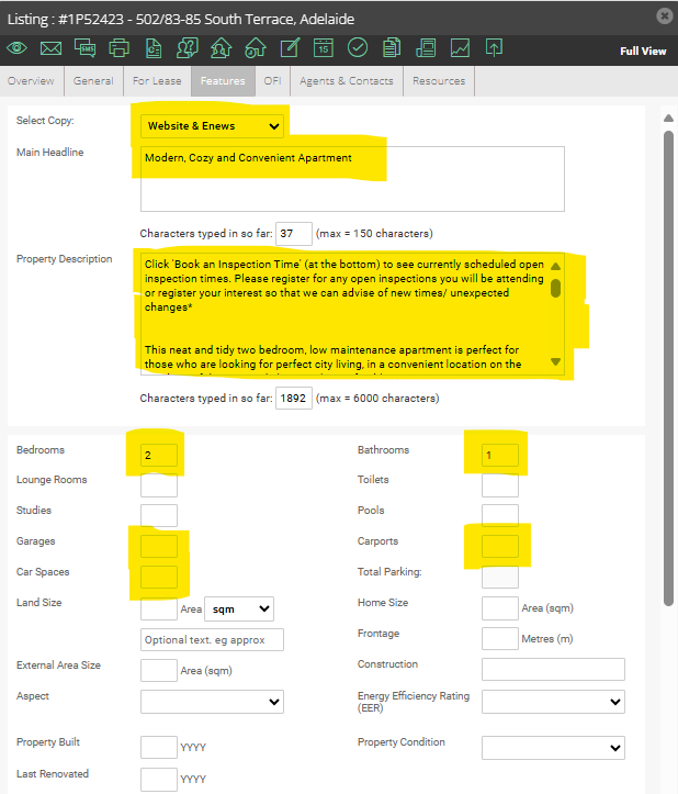 You will now have a new listing for the property. You will need to review the entire listing and every tab for the property to ensure that it is updated to reflect the new listing. Please check over all sections marked yellow. Disregard the other sections.