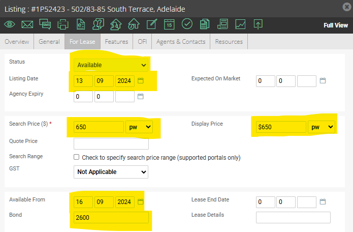 Select 'For Lease' from the pop up menu and confirm all other details are accurate.