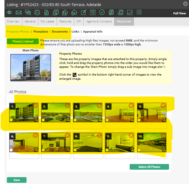 Resources - Add up to 20 photos under Property Photos tab. Please ensure they are all landscape. You can also put the Floorplan into the Floorplan tab. Under the Documents tab you will need to upload a copy of the Management Agreement. The property will not list without a Management Agreement.