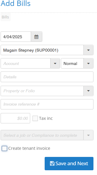 Step 3: Create a bill against the owner in Property Me, payable to Magain Stepney.