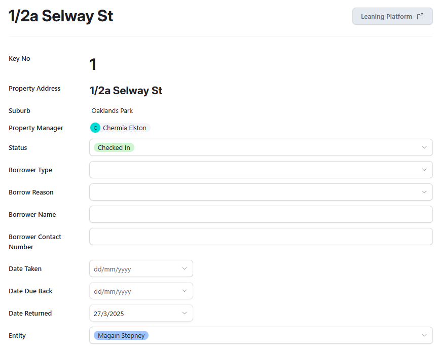 Step 1: Open the Key Tracker Key List page. Search via property address or key number. Enter the returned date. This will automatically change the status back to Checked In.
